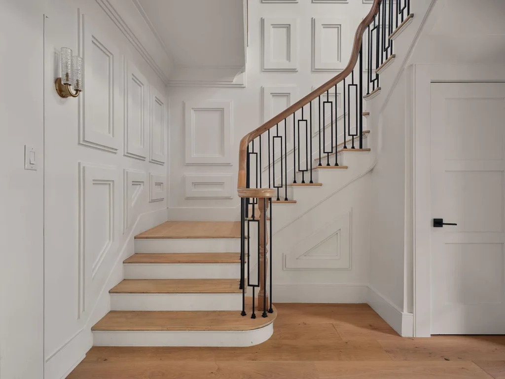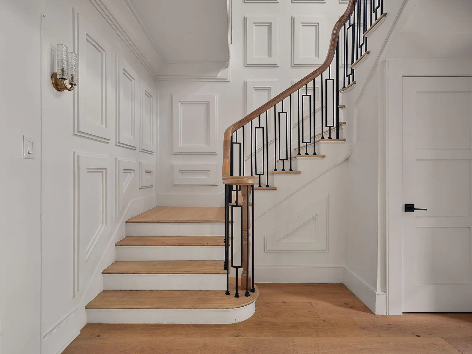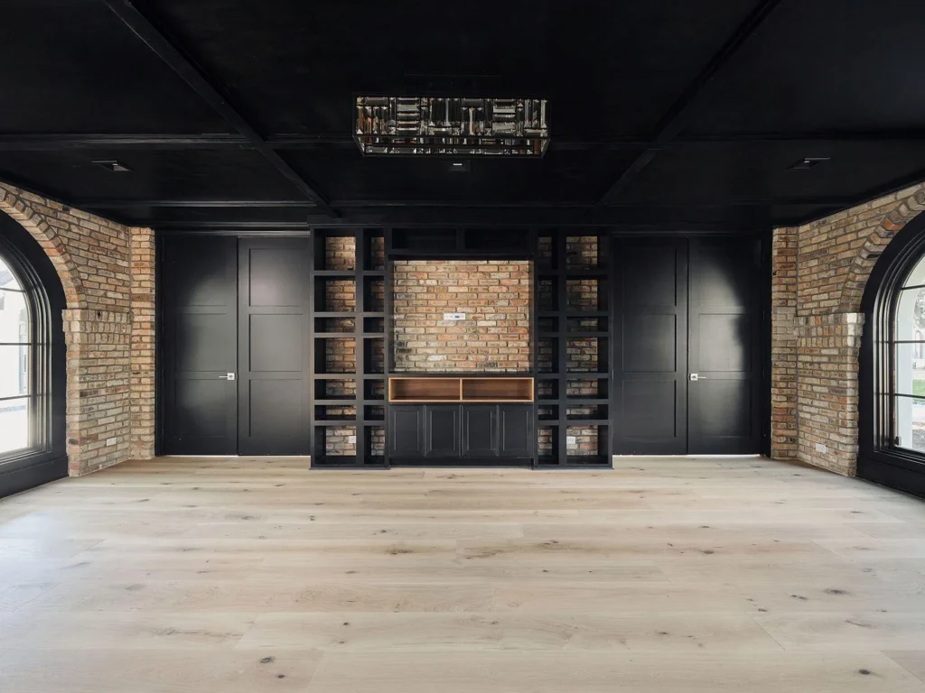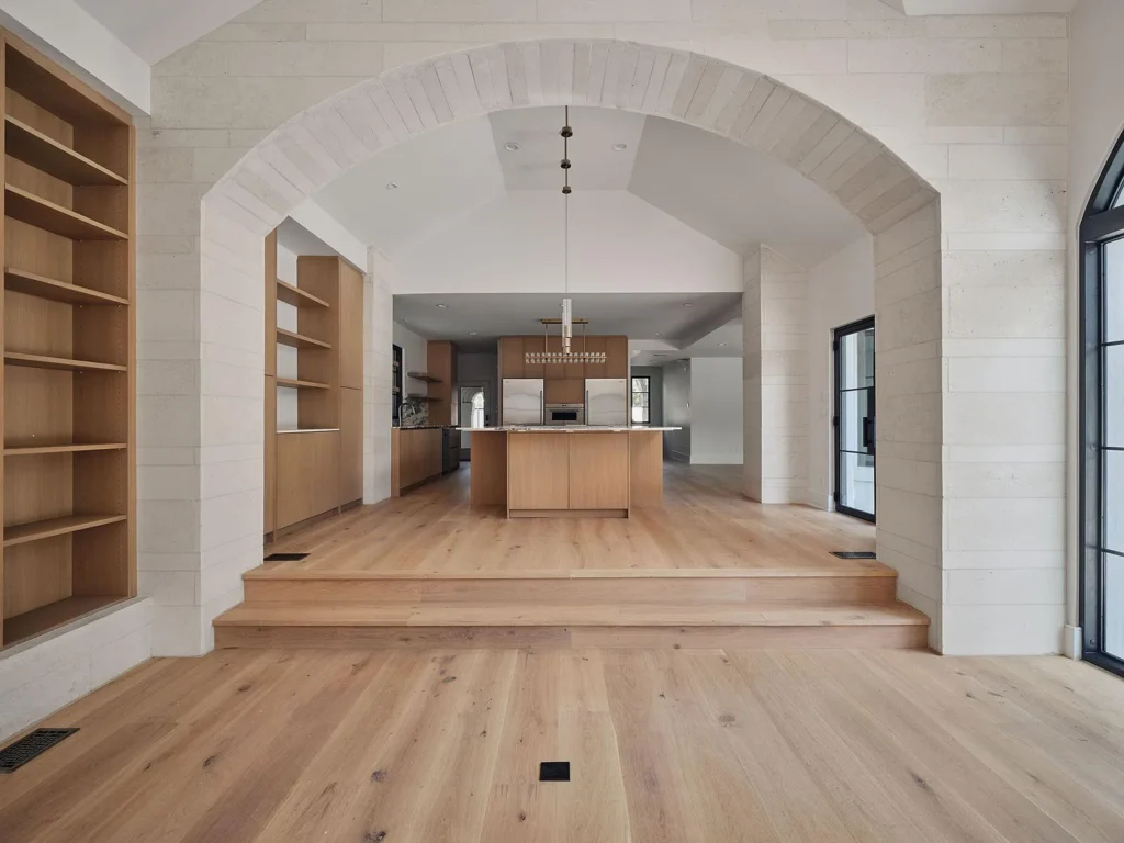 The light tone of the flooring highlights the organic beauty of European White Oak—its soft grain, subtle knots, and natural variation—creating an elegant yet inviting atmosphere throughout the open interior. The wide-plank design further elevates the space, adding a sense of continuity and luxury from room to room.