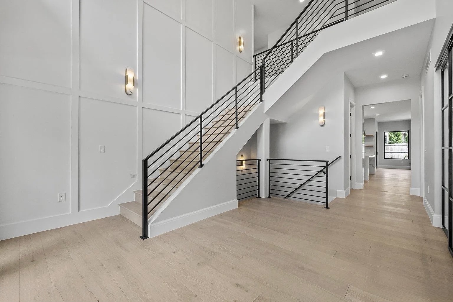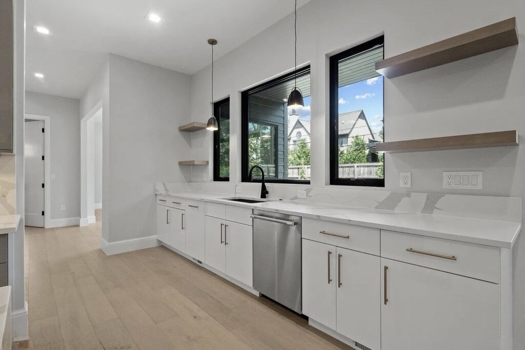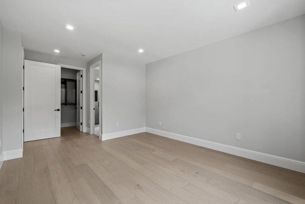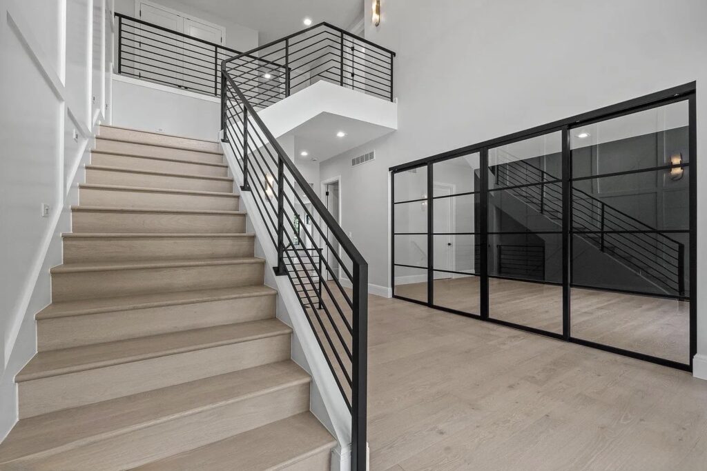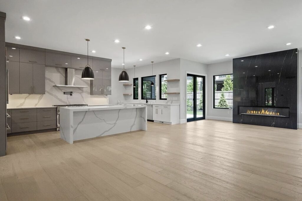 The soft white-washed tone of the flooring brings a natural brightness to every room, enhancing the open layout and emphasizing the home’s minimalist lines.