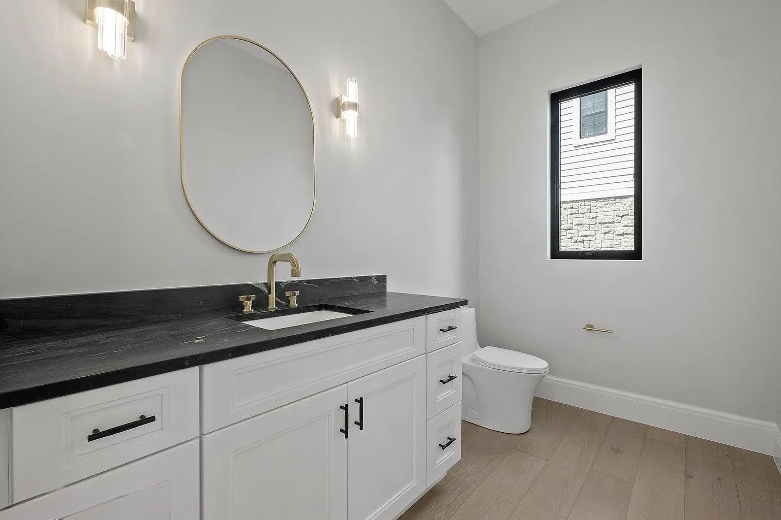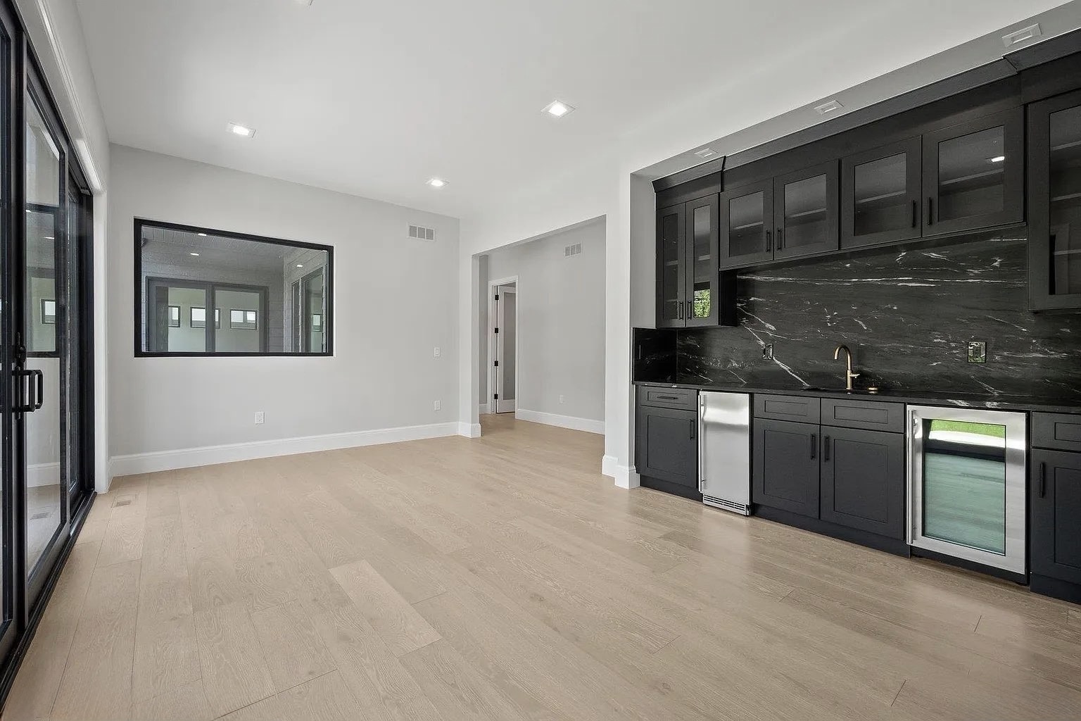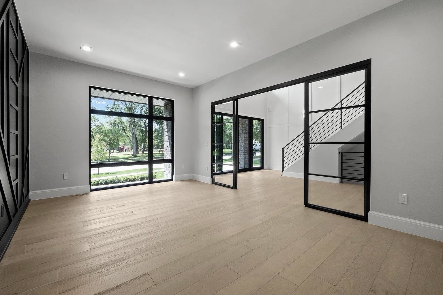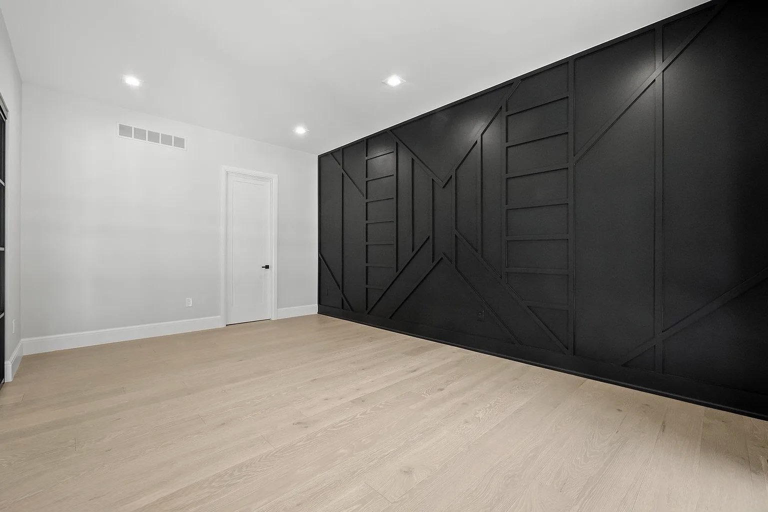The soft white-washed tone of the flooring brings a natural brightness to every room, enhancing the open layout and emphasizing the home’s minimalist lines.