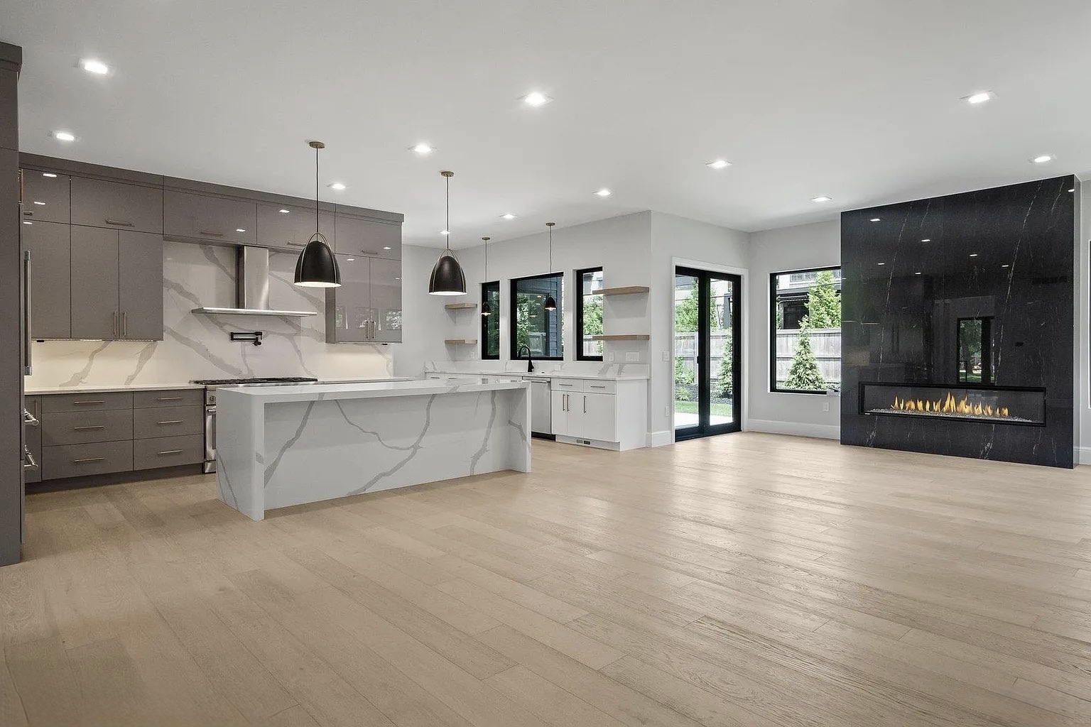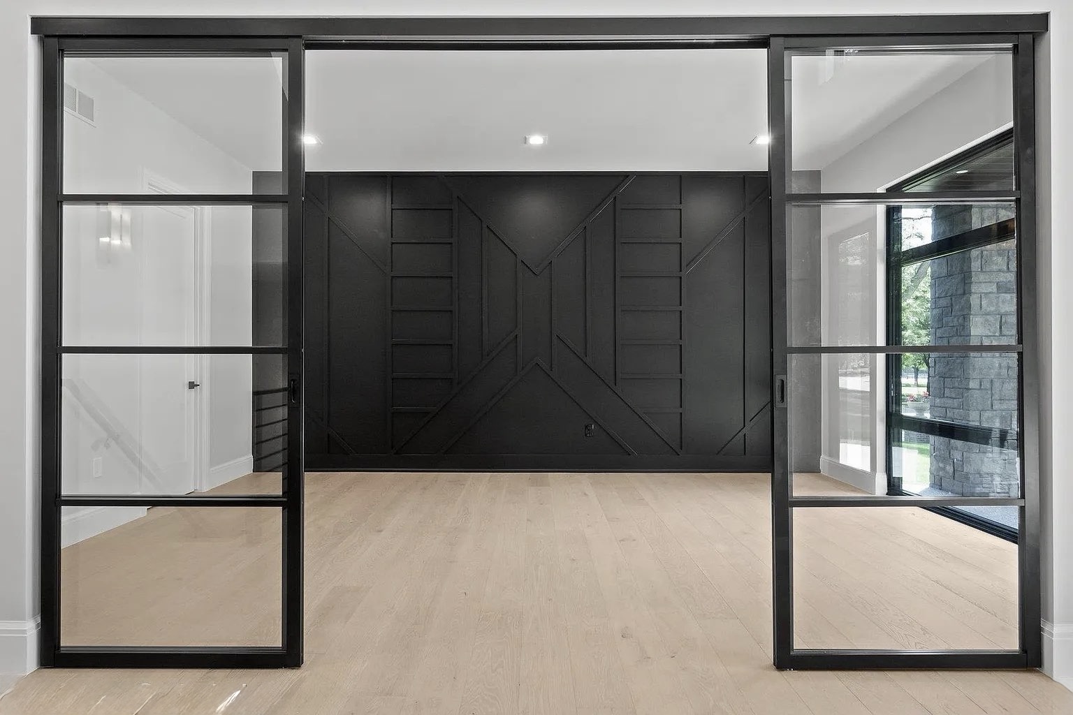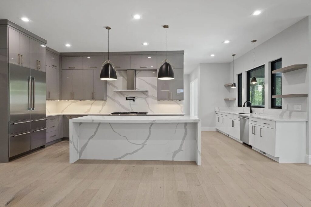 This stunning new construction home in the Detroit area showcases a bold, modern European-inspired design. The exterior combines clean architectural lines with a sophisticated mix of materials—natural stone, smooth stucco, and rich wood accents—creating a striking and contemporary facade.