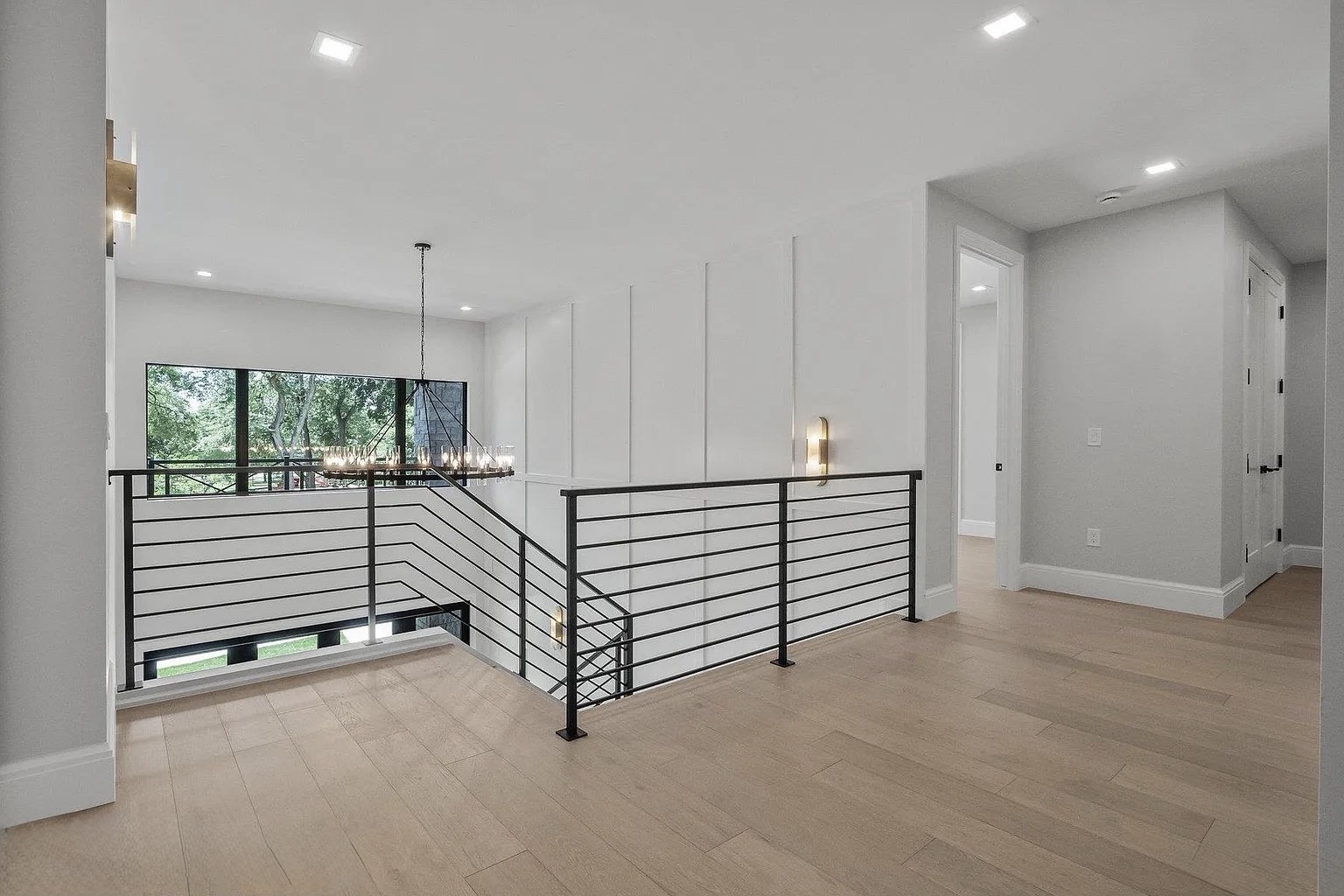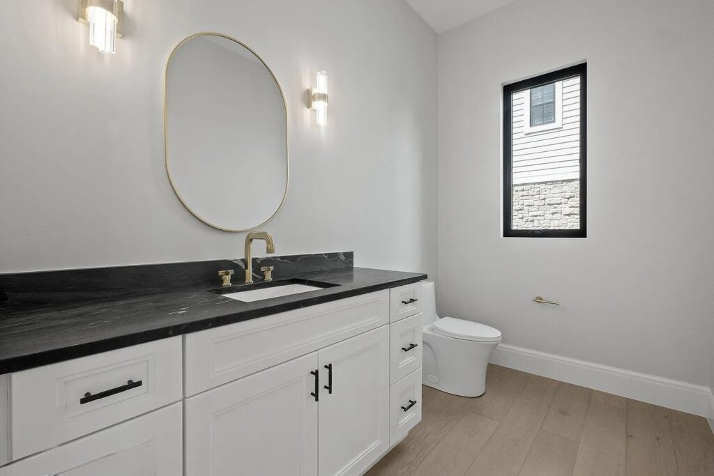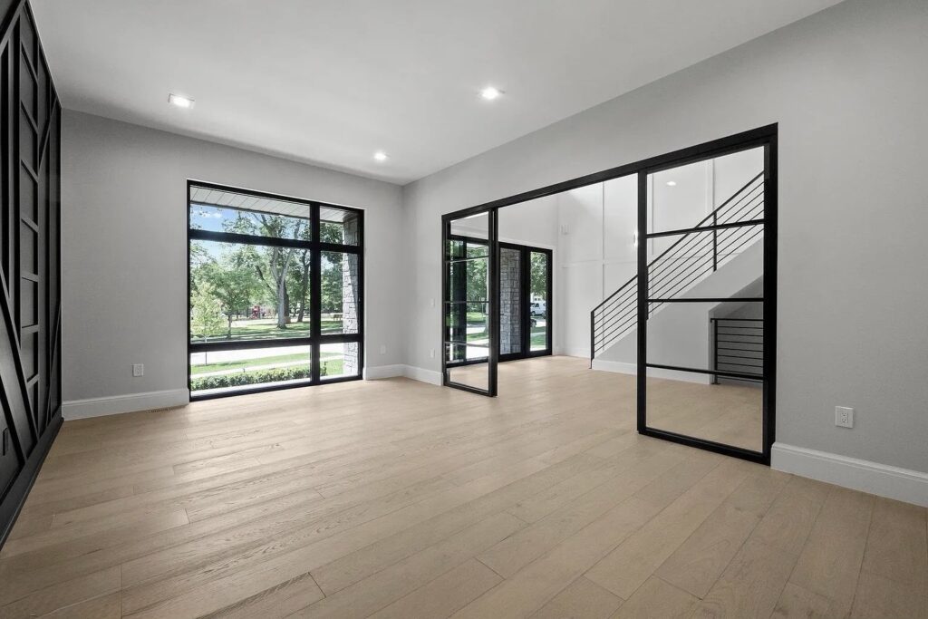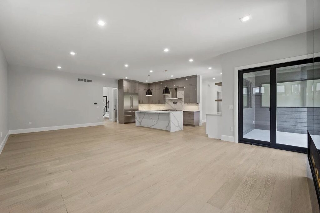 Throughout the main floor, upper hallway, office, and bedrooms, the flooring creates a seamless flow, making the home feel both expansive and cohesive.