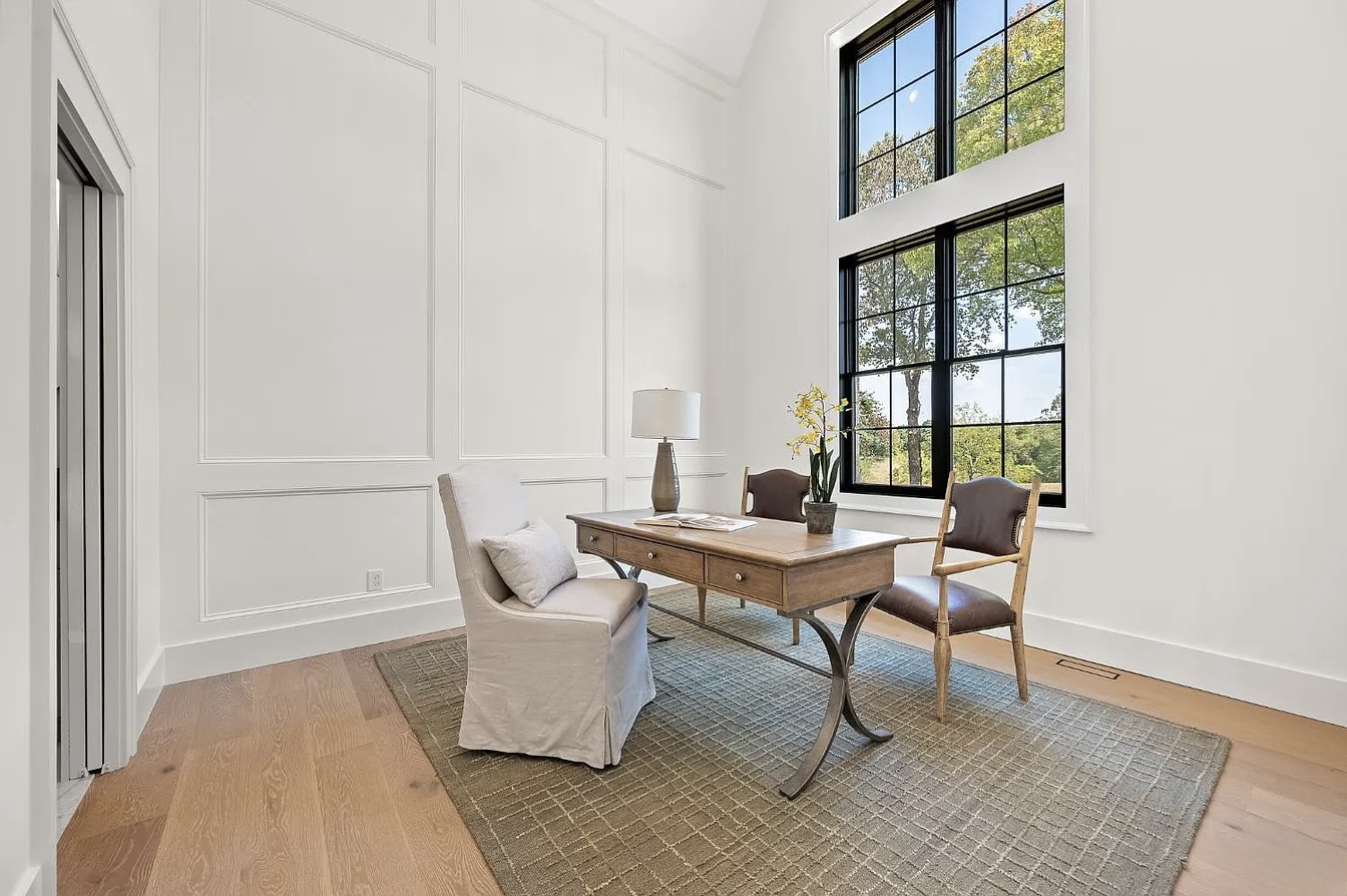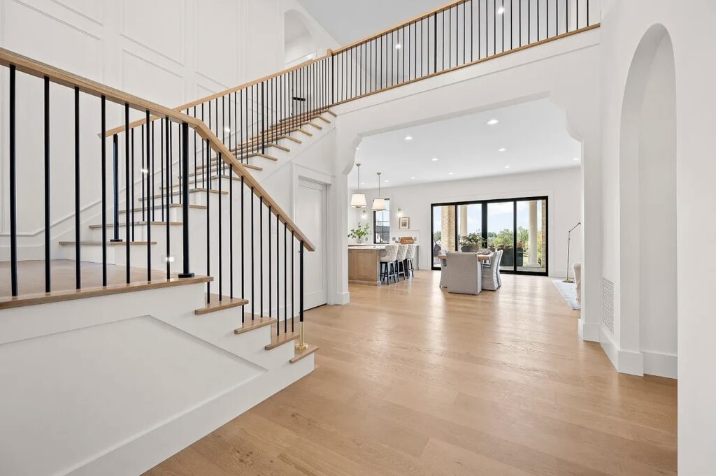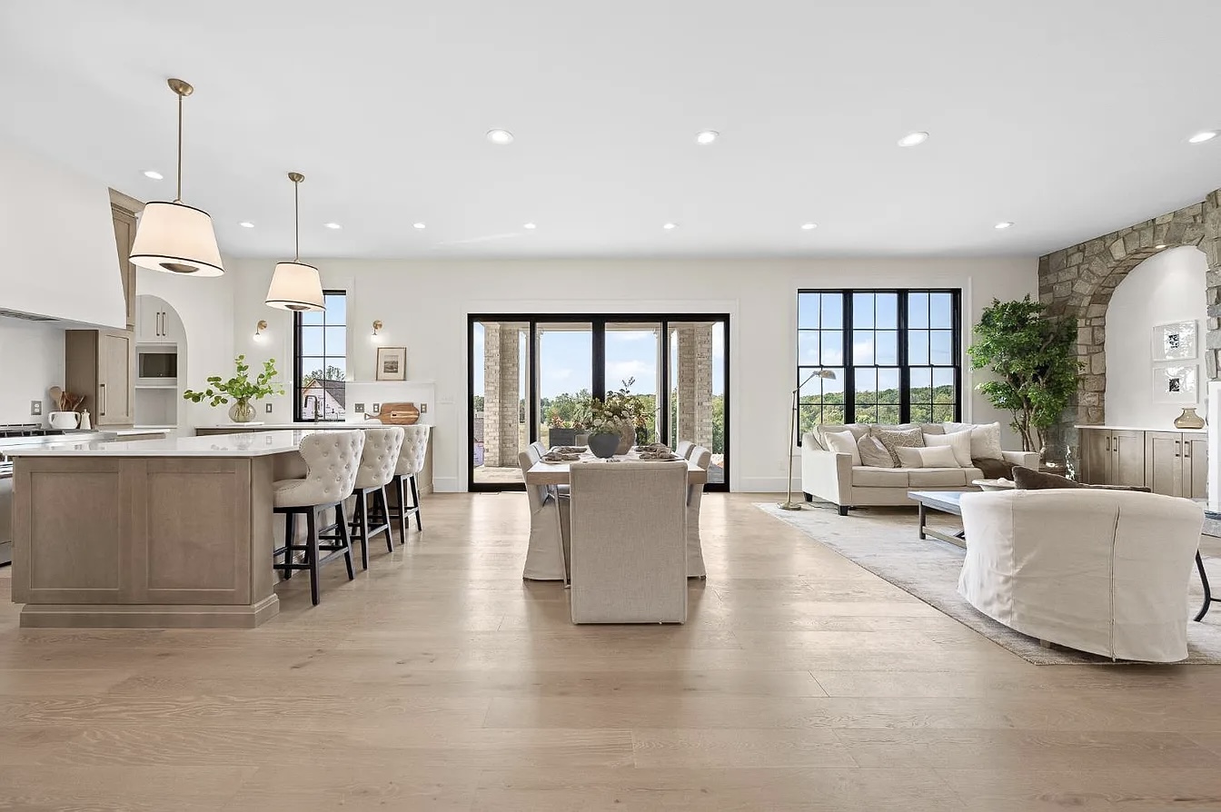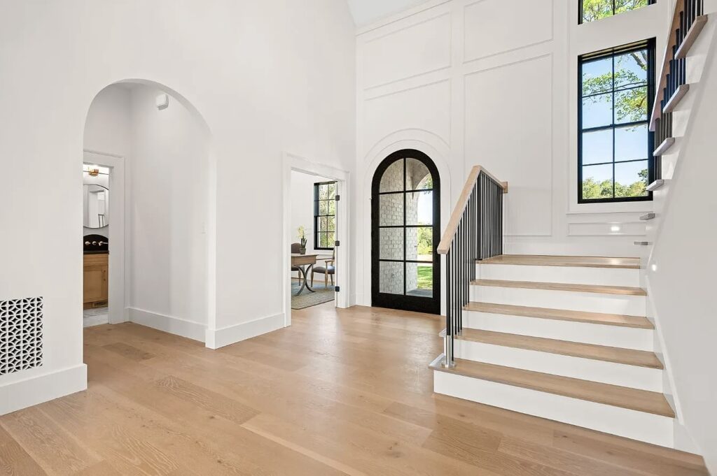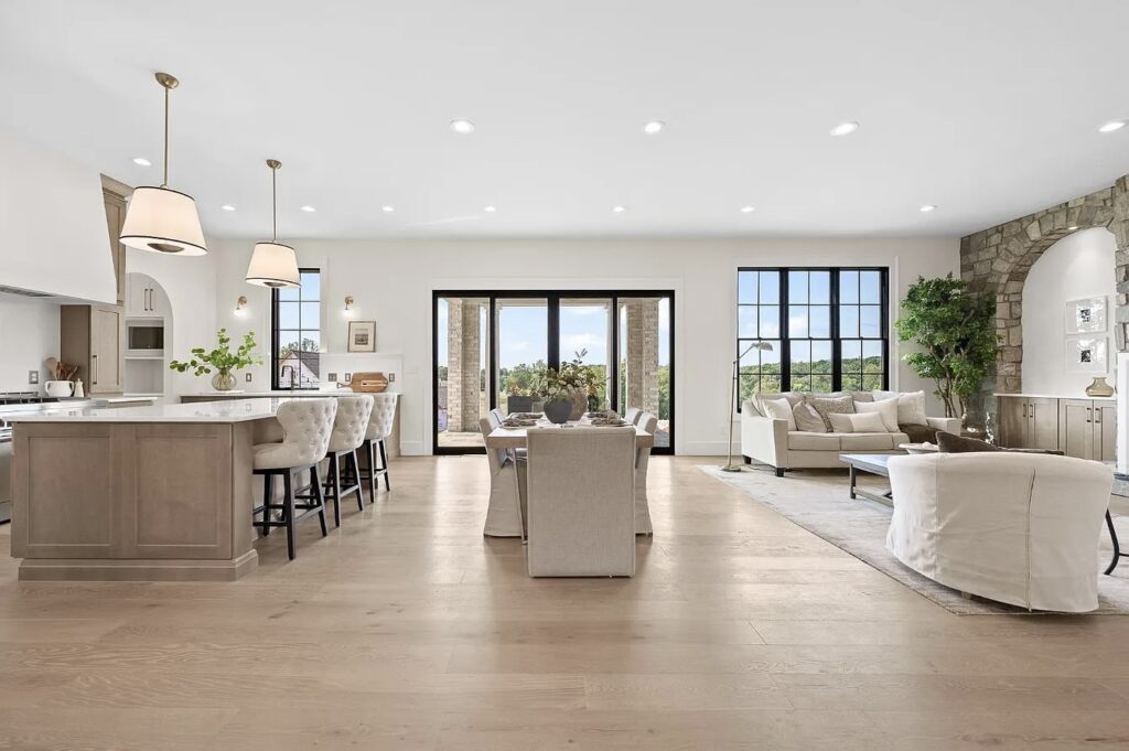 This stunning estate in Virginia showcases a modern interpretation of European-inspired architecture. The exterior features elegant white-painted brick, steep rooflines, arched entry details, and tall black-framed windows that bring in abundant natural light.