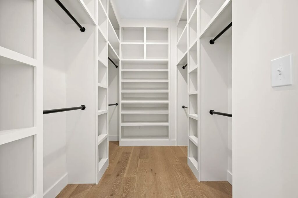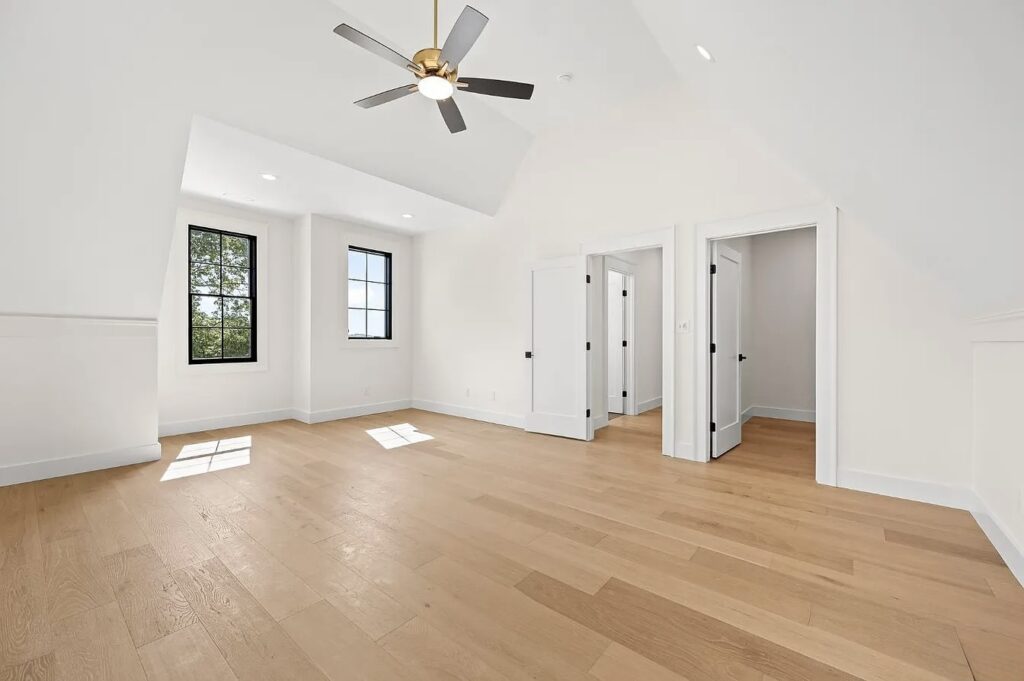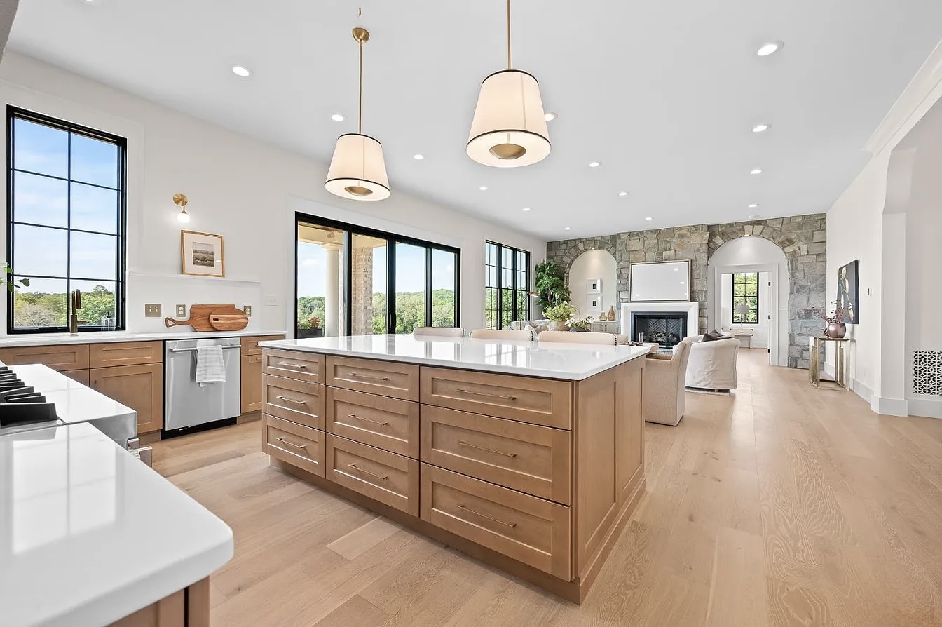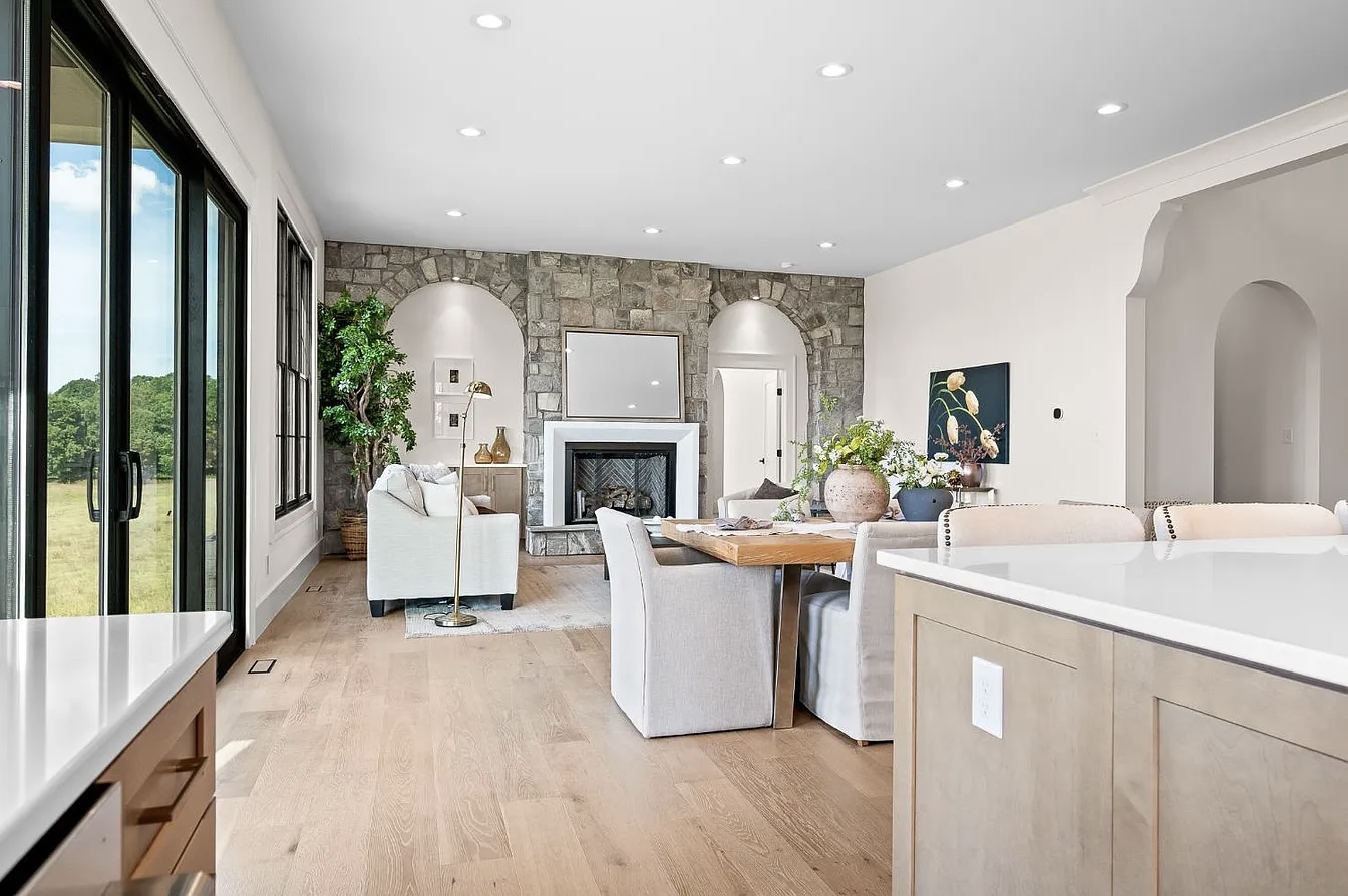 This stunning estate in Virginia showcases a modern interpretation of European-inspired architecture. The exterior features elegant white-painted brick, steep rooflines, arched entry details, and tall black-framed windows that bring in abundant natural light.