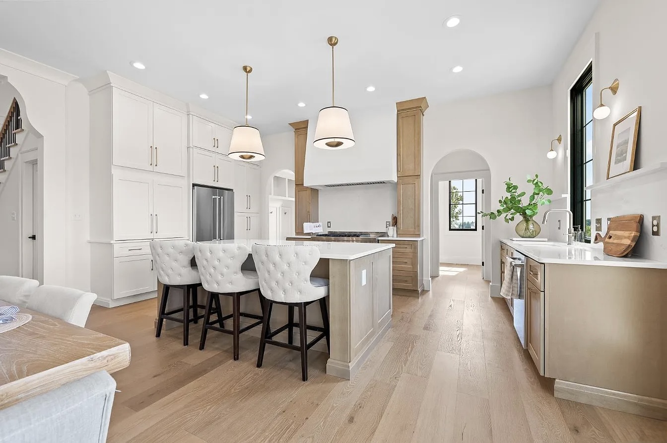 The interior flooring was finished with European White Oak in the popular Smoke 5% color from our Aurum Collection, chosen for its soft, natural tone that beautifully complements the neutral palette and light wood cabinetry. Wide-plank installation enhances the open floor plan, making each room feel brighter, larger and more cohesive.