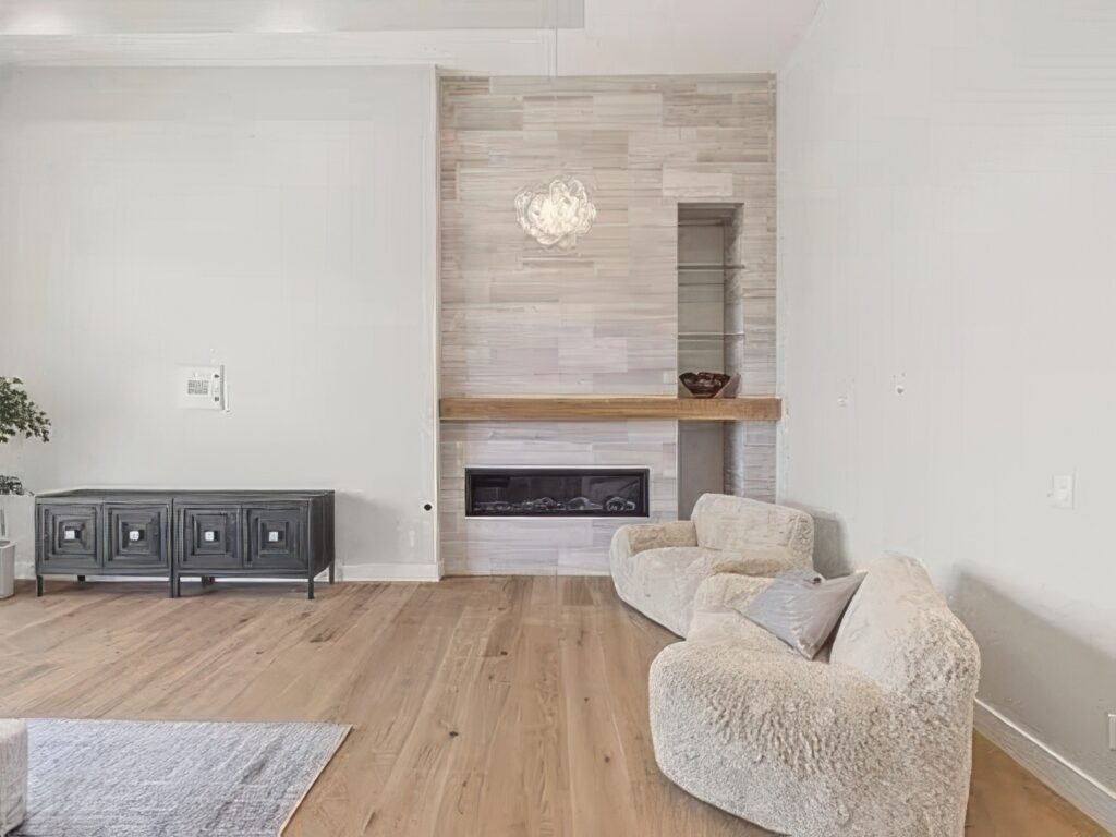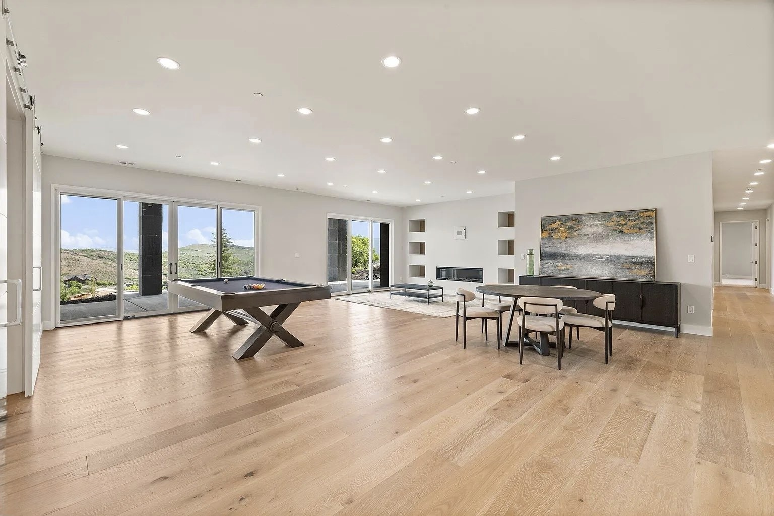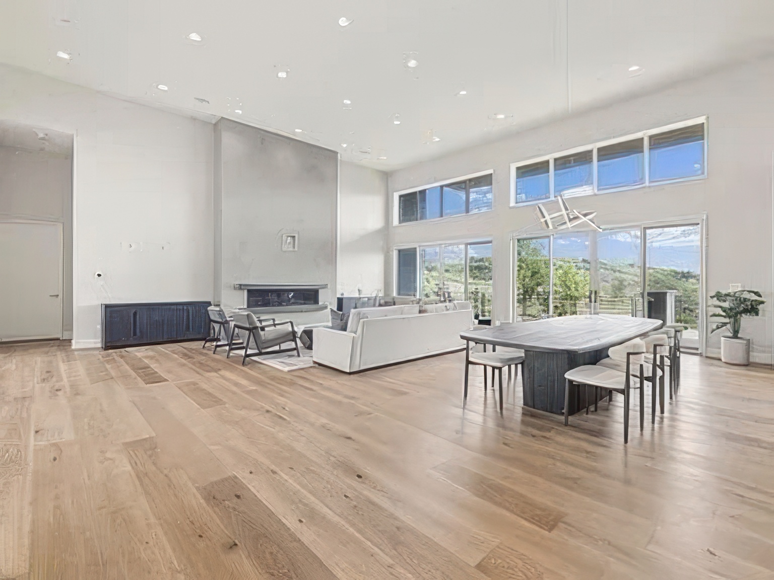 The soft, natural tones of the flooring bring warmth and balance to the contemporary architecture, complementing the minimalist lines of the kitchen, expansive windows, and high ceilings. The subtle smoke finish enhances the wood’s authentic European character while maintaining a clean, modern aesthetic that flows seamlessly throughout the living spaces, bedrooms, and entertaining areas.