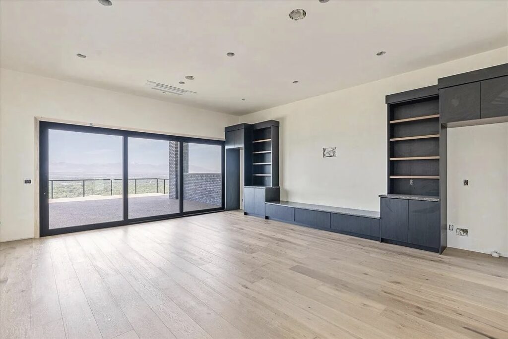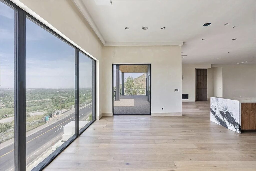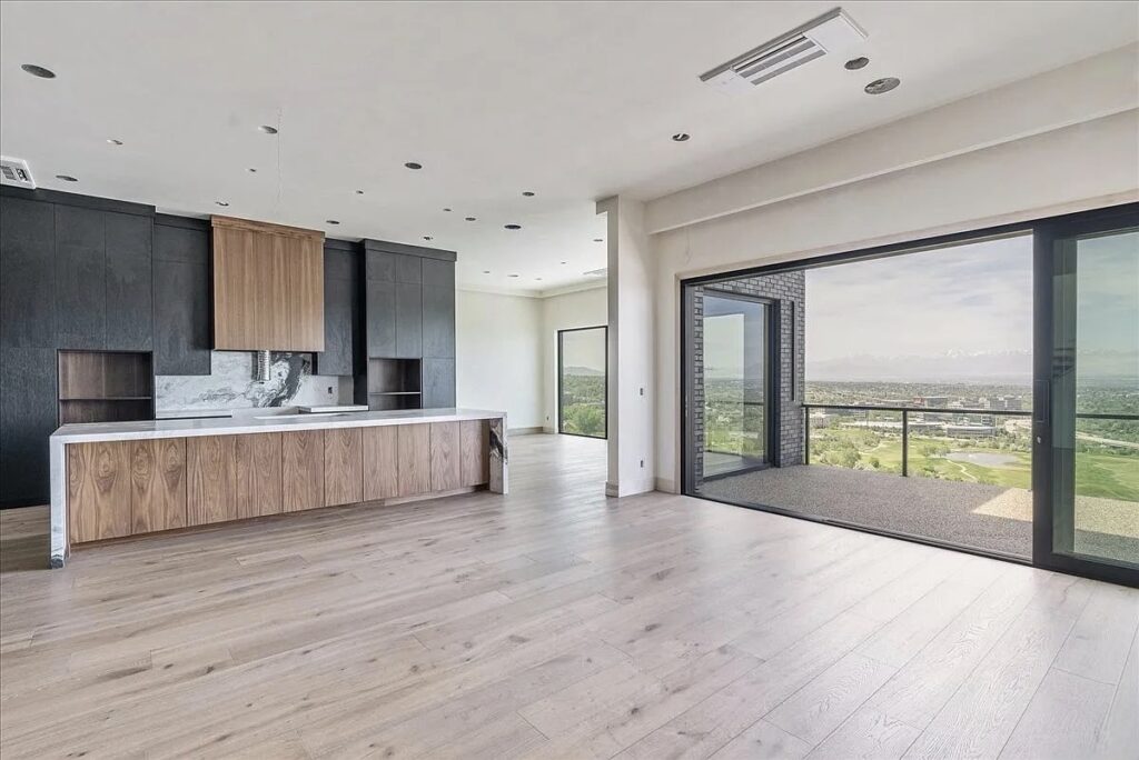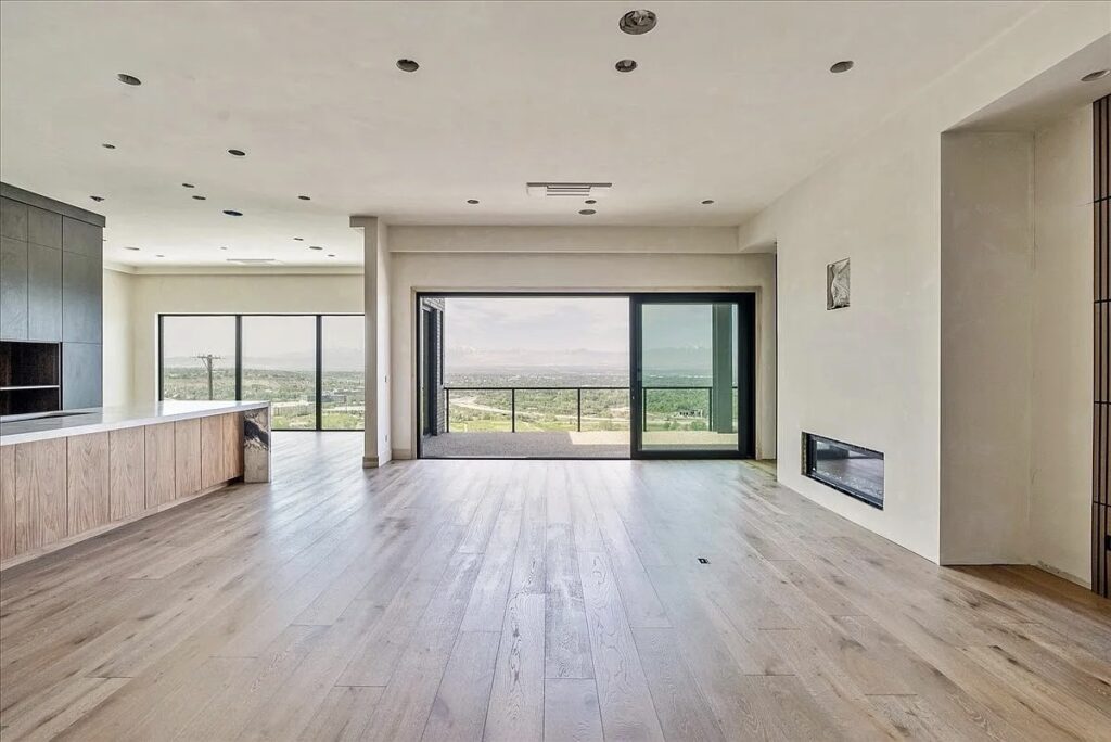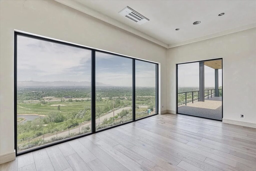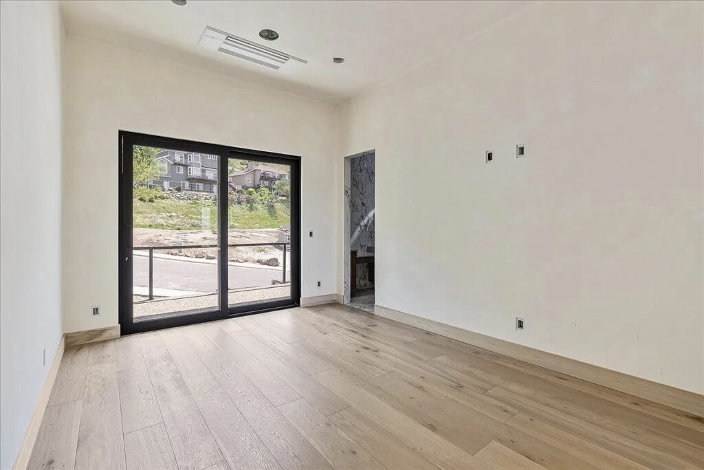 This new construction in Park City, Utah is a striking example of modern minimalism, blending sleek architectural lines with the rugged beauty of its mountain surroundings. The home’s dark facade, accented with clean geometric forms and expansive glass walls, creates a bold contrast against the light tones of the hillside.