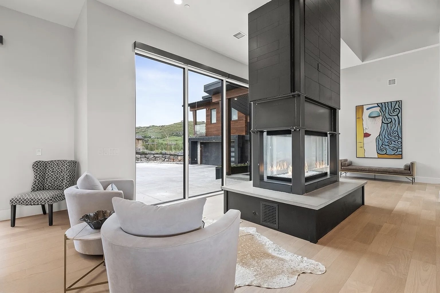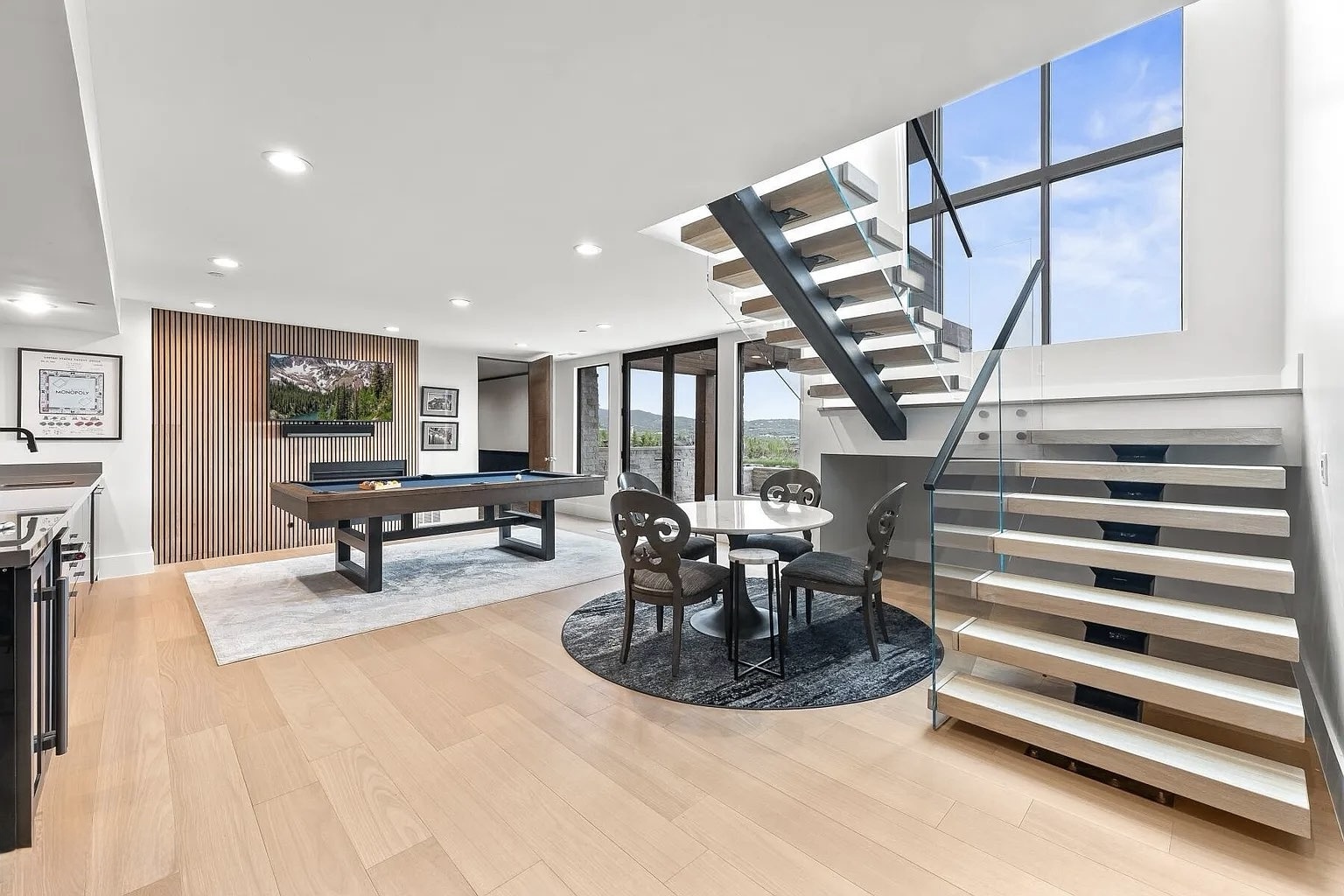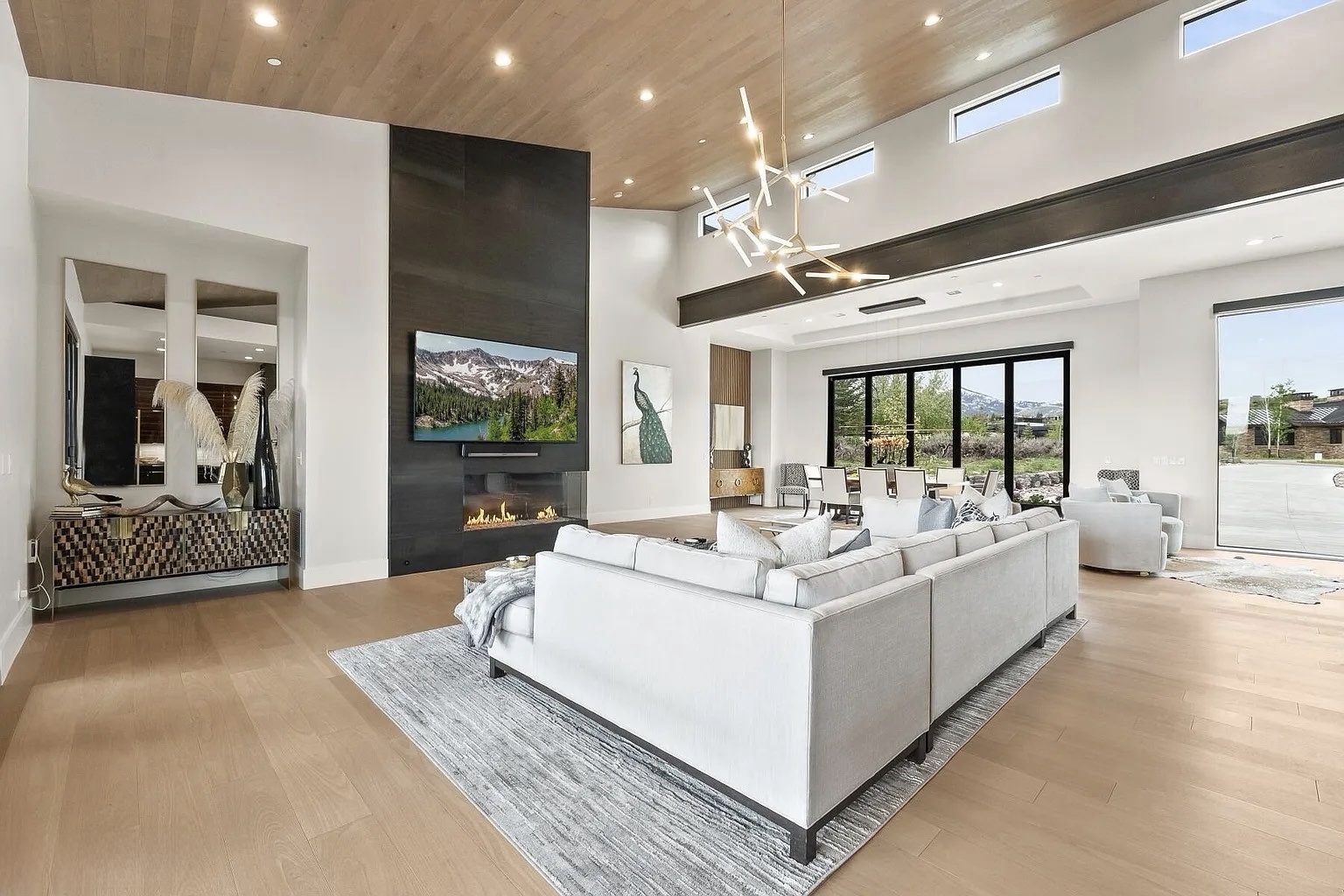 This stunning modern residence in Park City, Utah blends natural materials with sleek architectural lines, creating a perfect balance between contemporary design and mountain living. The exterior features warm wood siding, stone accents, and expansive glass windows that capture breathtaking views of the surrounding peaks.