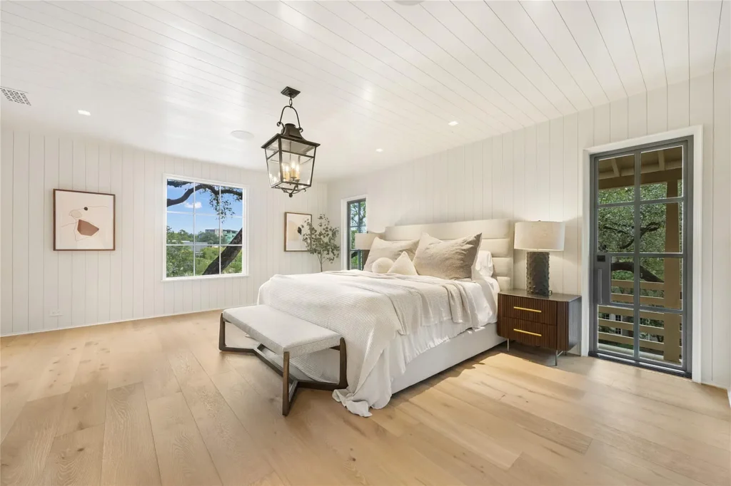 This remarkable Texas project stands out for its creative and sophisticated use of European White Oak beyond traditional flooring applications. Instead of limiting the material to the interior floors, the designers took a bold and original approach — incorporating White Oak planks vertically as exterior siding, creating a warm and organic facade that blends beautifully with the surrounding landscape. Even the garage doors were crafted from the same White Oak planks, resulting in a seamless and cohesive architectural aesthetic rarely seen in residential design.