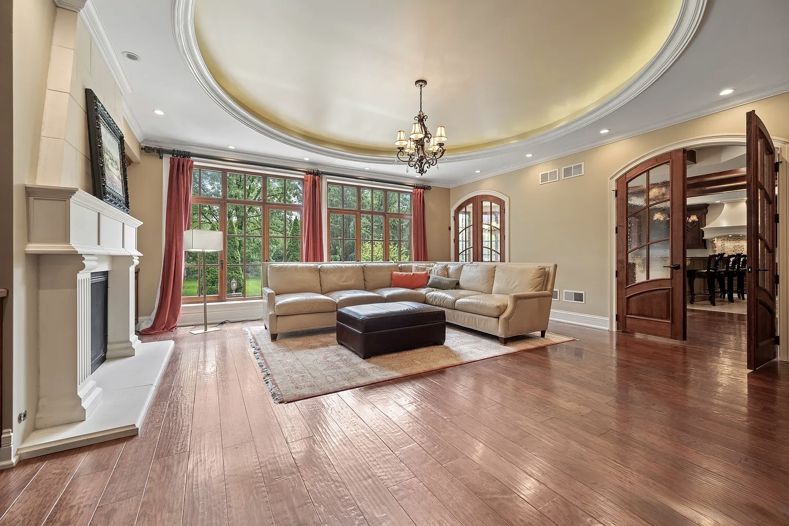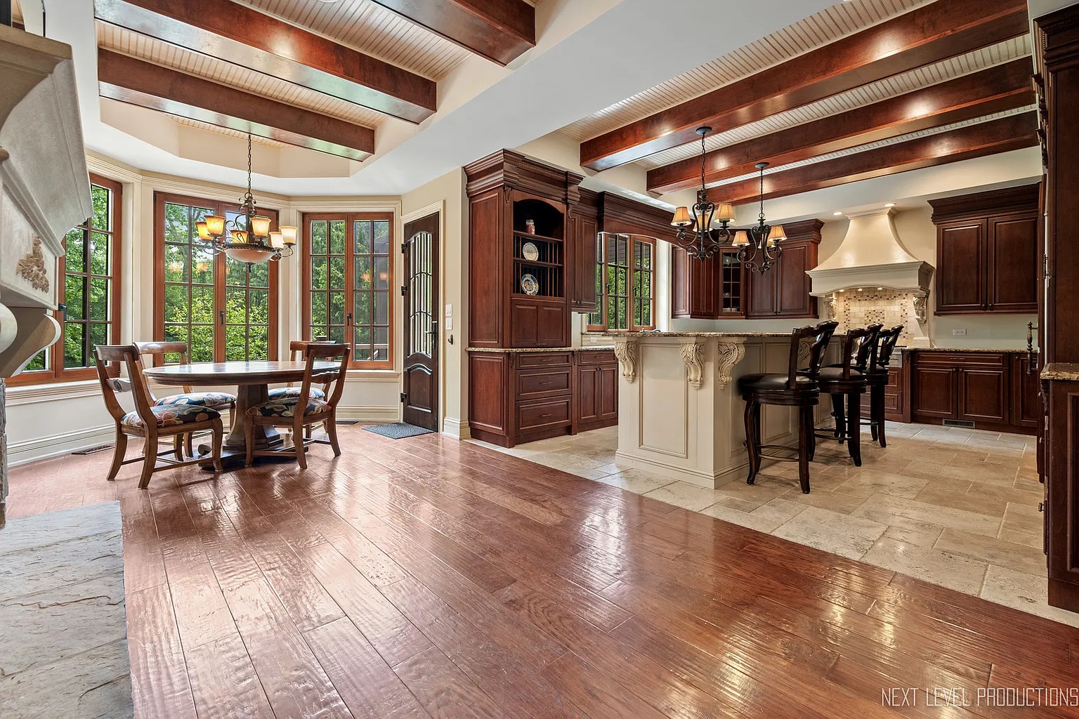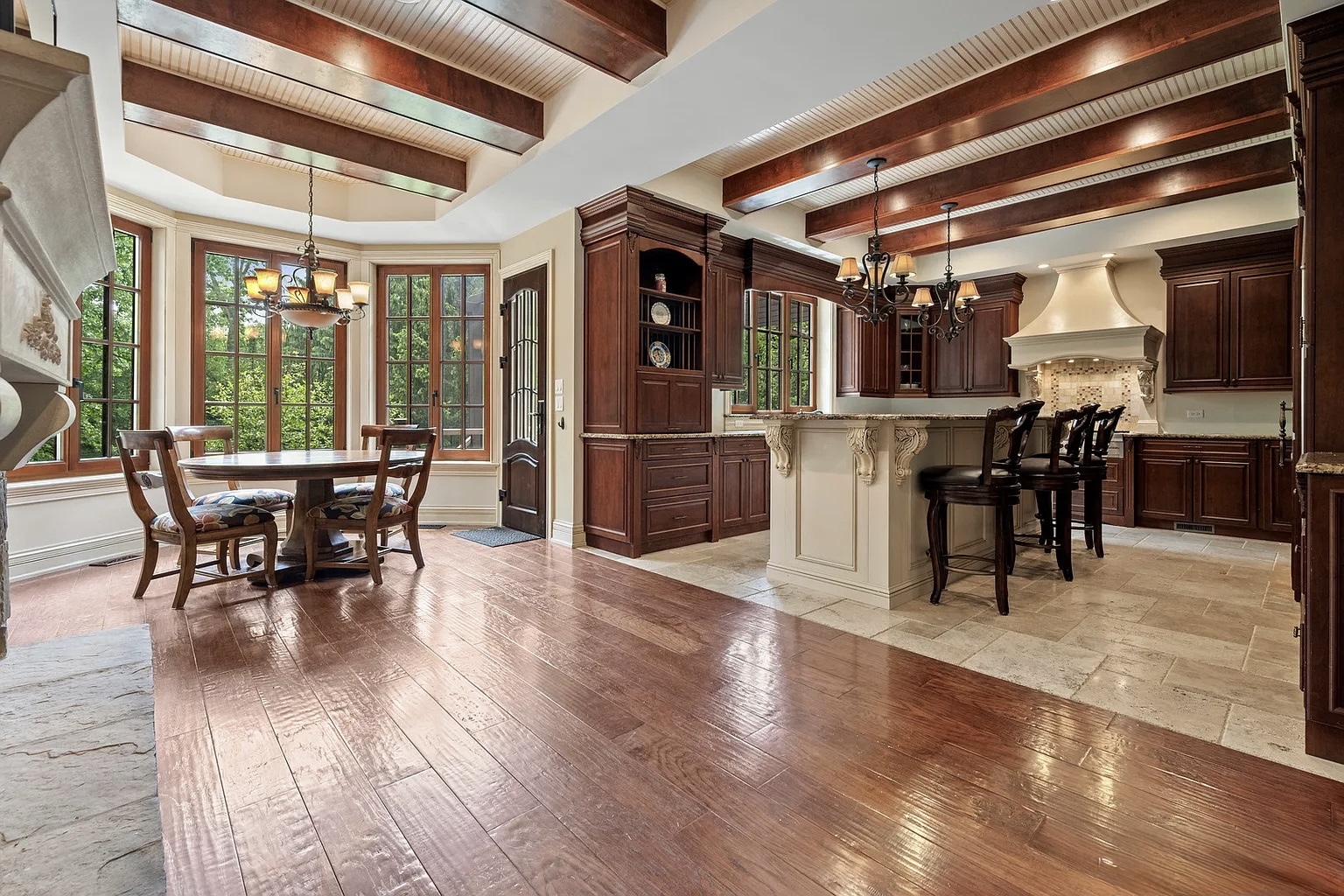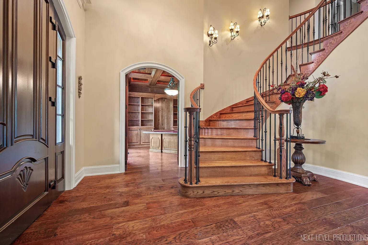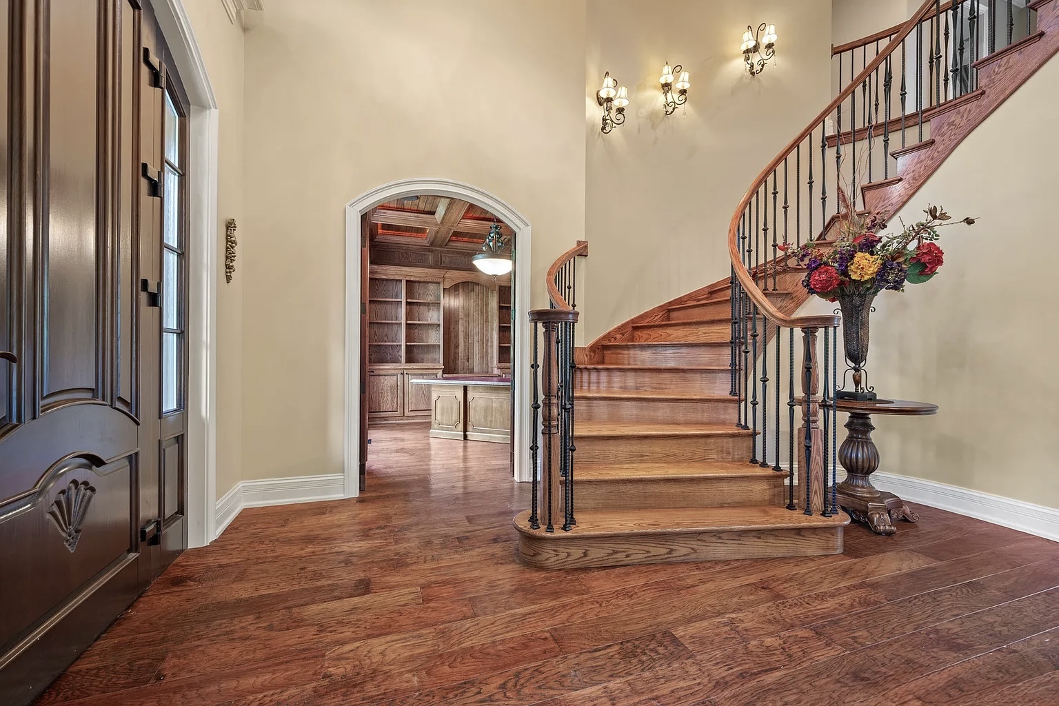 This home showcases how thoughtful details — like the custom floors — can transform a residence into a one-of-a-kind masterpiece. The hand-scraped and stained hardwood design adds both texture and luxury, perfectly complementing the grand architecture and creating an inviting yet timeless aesthetic.