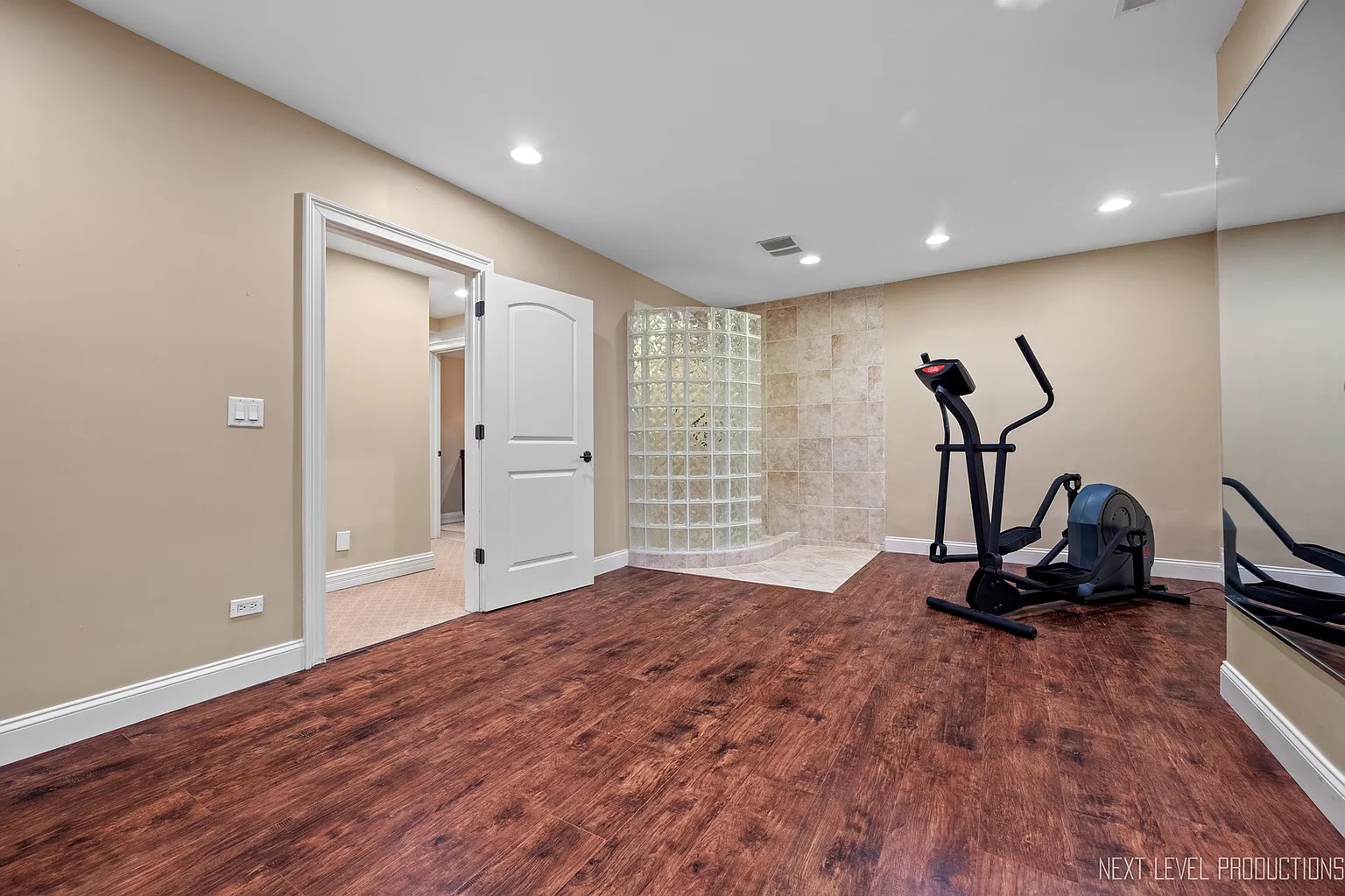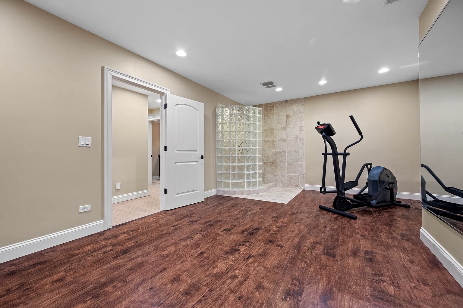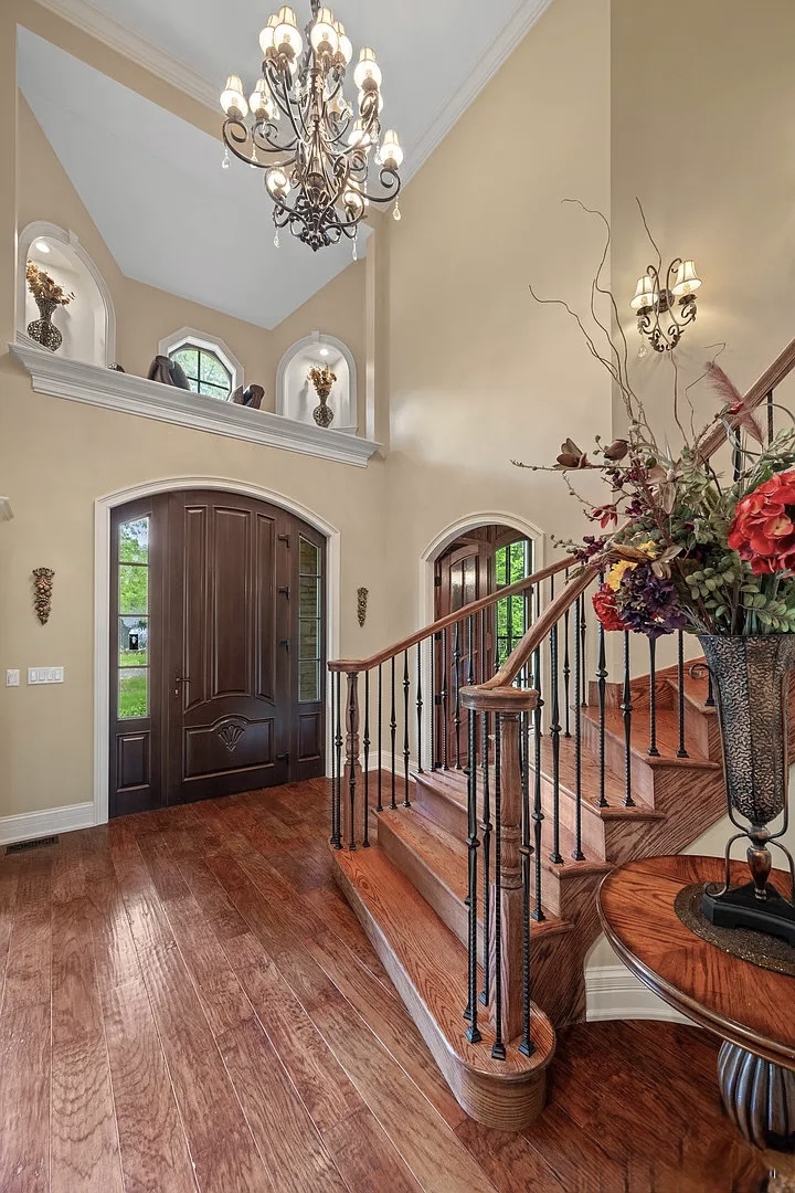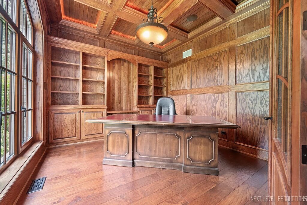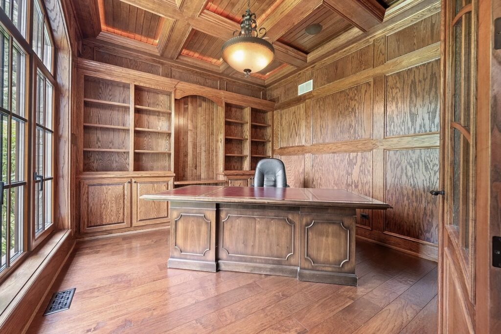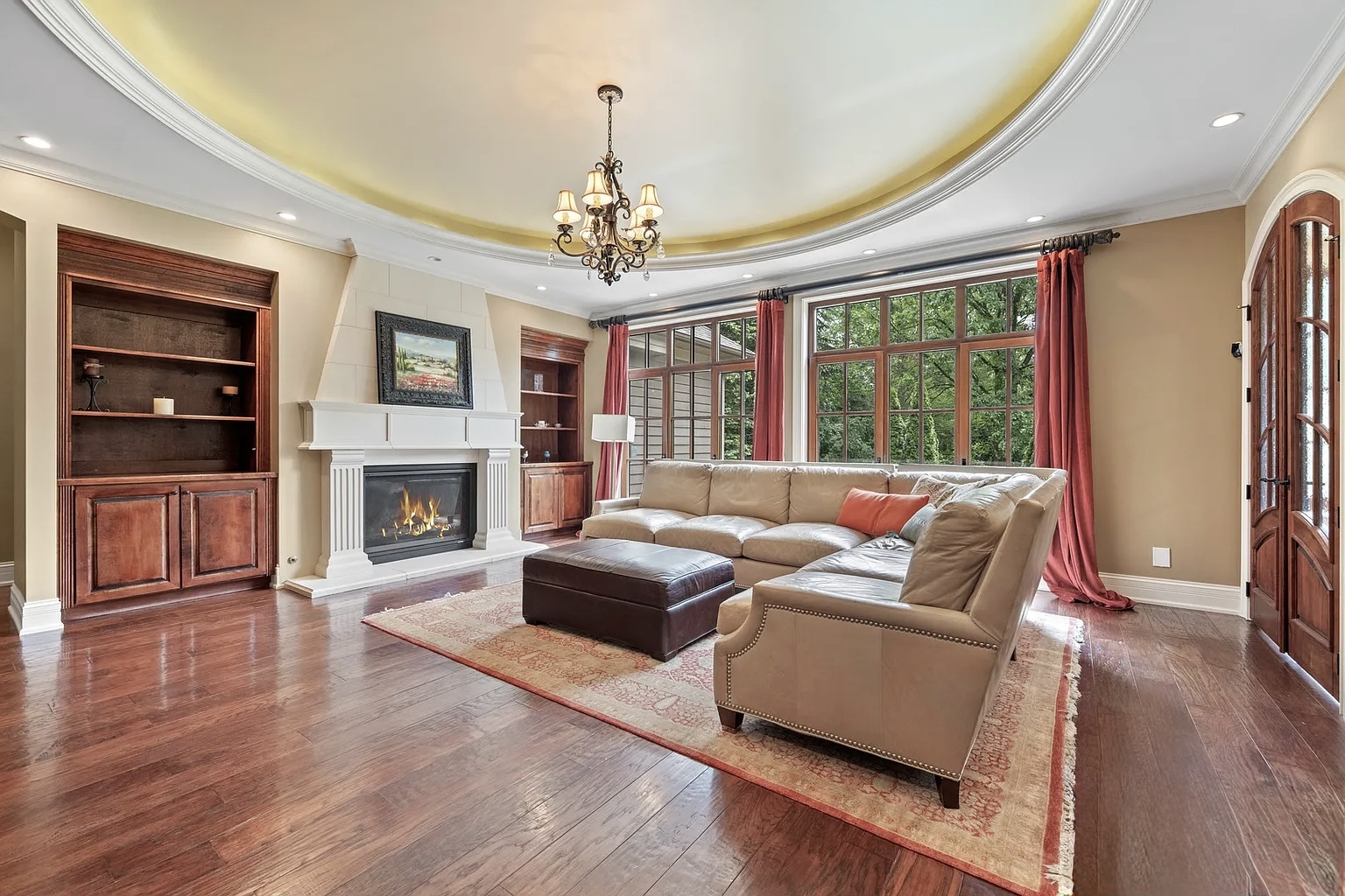 This home showcases how thoughtful details — like the custom floors — can transform a residence into a one-of-a-kind masterpiece. The hand-scraped and stained hardwood design adds both texture and luxury, perfectly complementing the grand architecture and creating an inviting yet timeless aesthetic.