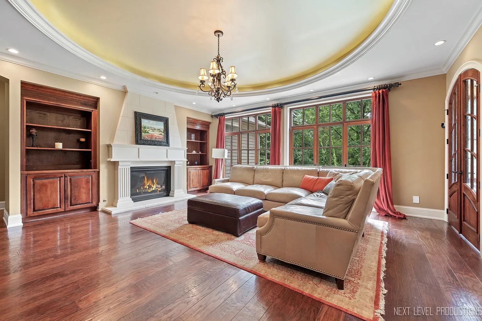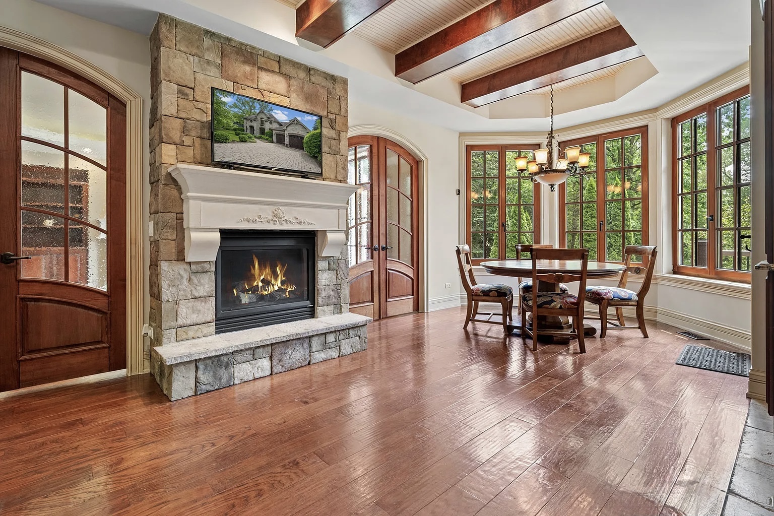 This residence in Warrenville, Illinois is a striking example of European-inspired architecture, blending elements of French Country and Tudor Revival design. The exterior is clad in natural stone with intricate detailing, arched windows, and wooden carriage-style garage doors, which together create a timeless and sophisticated appearance.