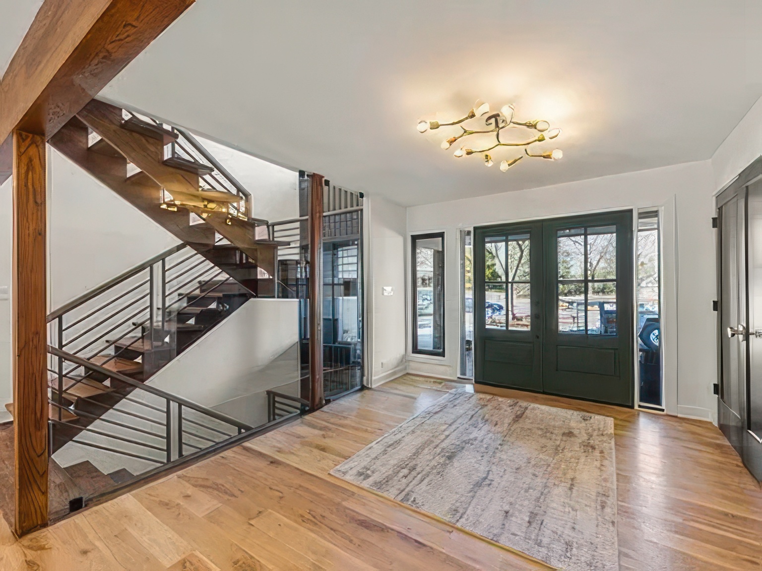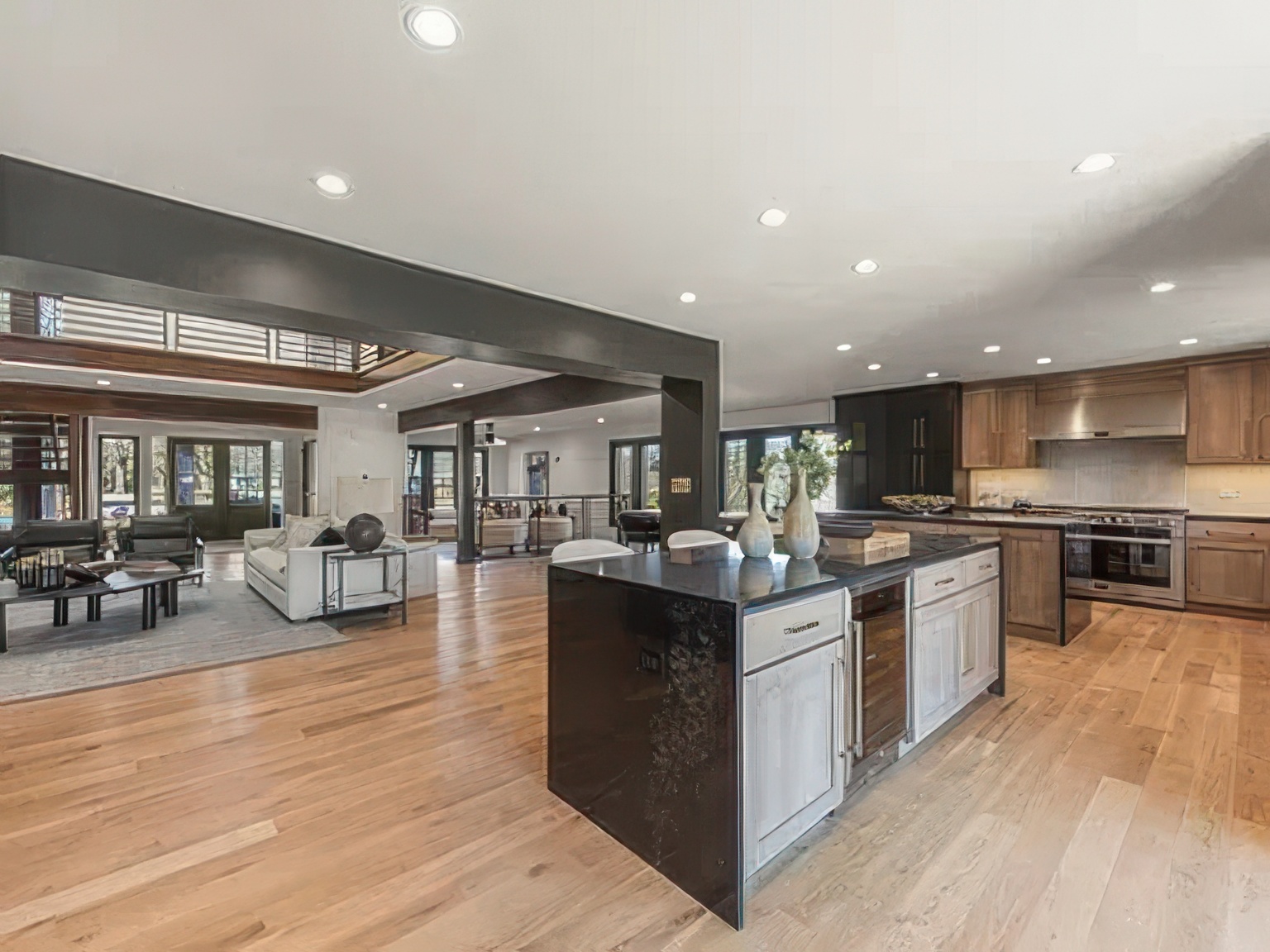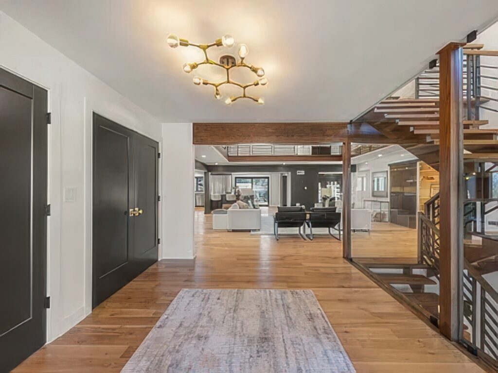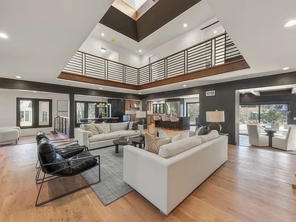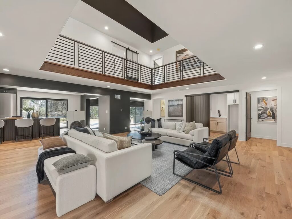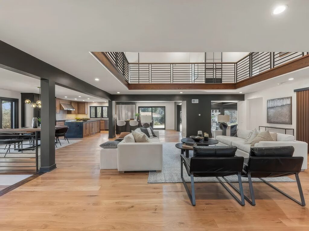 This remodel showcases a stunning modern interior with an open floor plan, double-height ceilings, and sleek architectural details. The flooring features Smoke 5% from the Aurum Collection, a finish that enhances the depth and texture of European White Oak, bringing warmth and sophistication.
