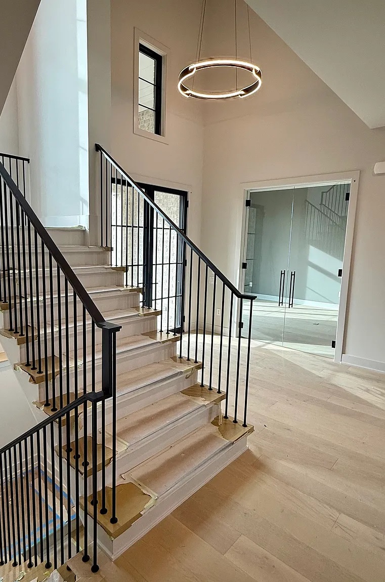 This project in Zionsville finished with European White Oak flooring in the shade Mist. This color from a Aurum Collection brings a warm, natural tone that beautifully complements the home’s modern architecture. Its soft beige undertone highlights the European White Oak’s texture, adding depth and elegance throughout the open living spaces.